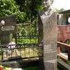 Фотография № 550. Особенность этого памятника заключена в его композиции. Строгие геометрические формы мемориала подчеркиваются и дополняются основным художественным элементом. В качестве этого элемента выступает высокохудожественная скульптура в виде головы покойного, высеченная из части гранитной глыбы памятника, и лежащей у его подножия собаки. Памятник выполнен из красного гранита.
